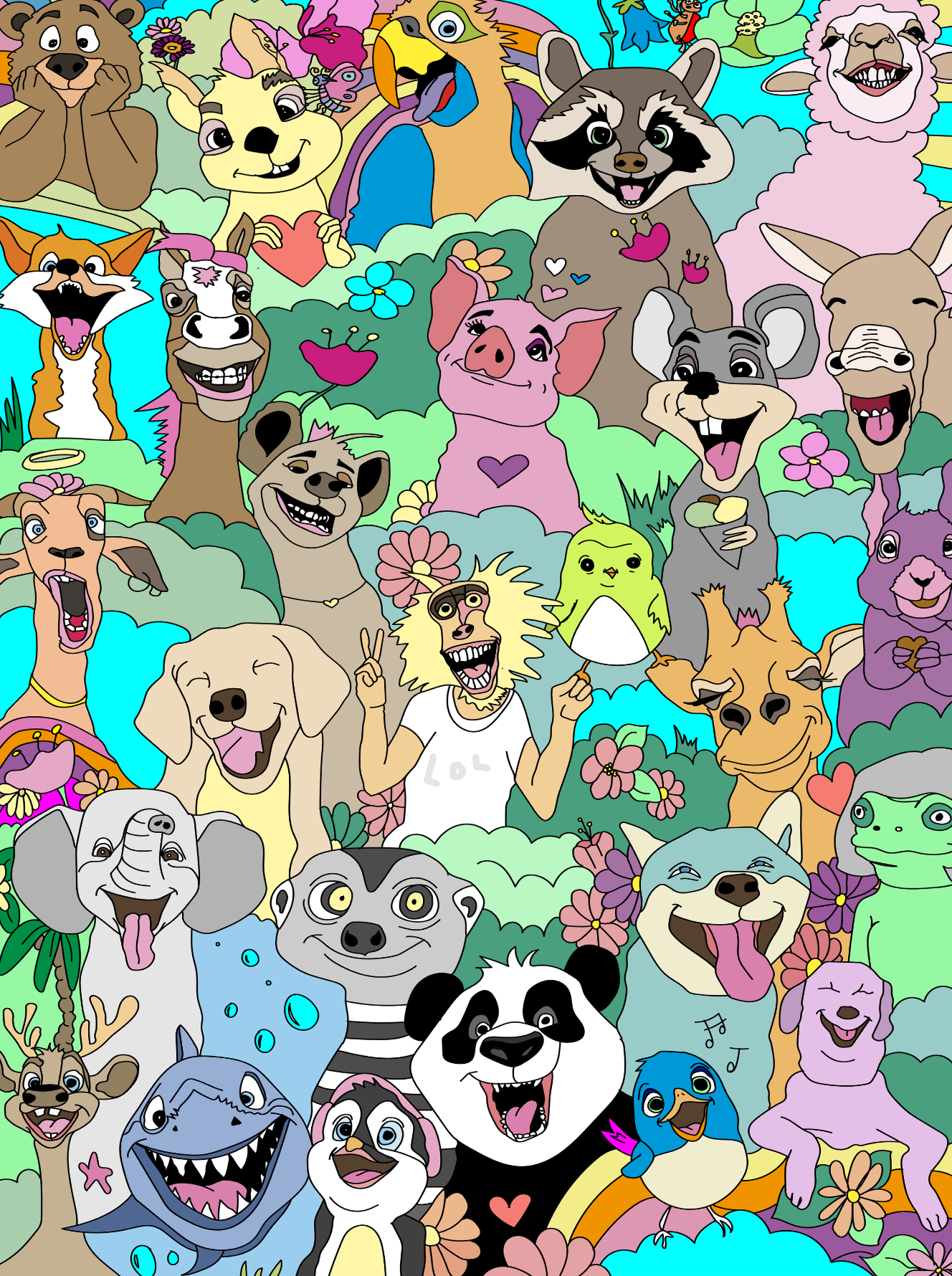 Grafisk illustrasjon av dyr med latterkrampe, trykket på 200 gram coated papir. Perfekt til barnerommet, venterommet på kontoret eller et sted du bare ønsker å glede noen.
